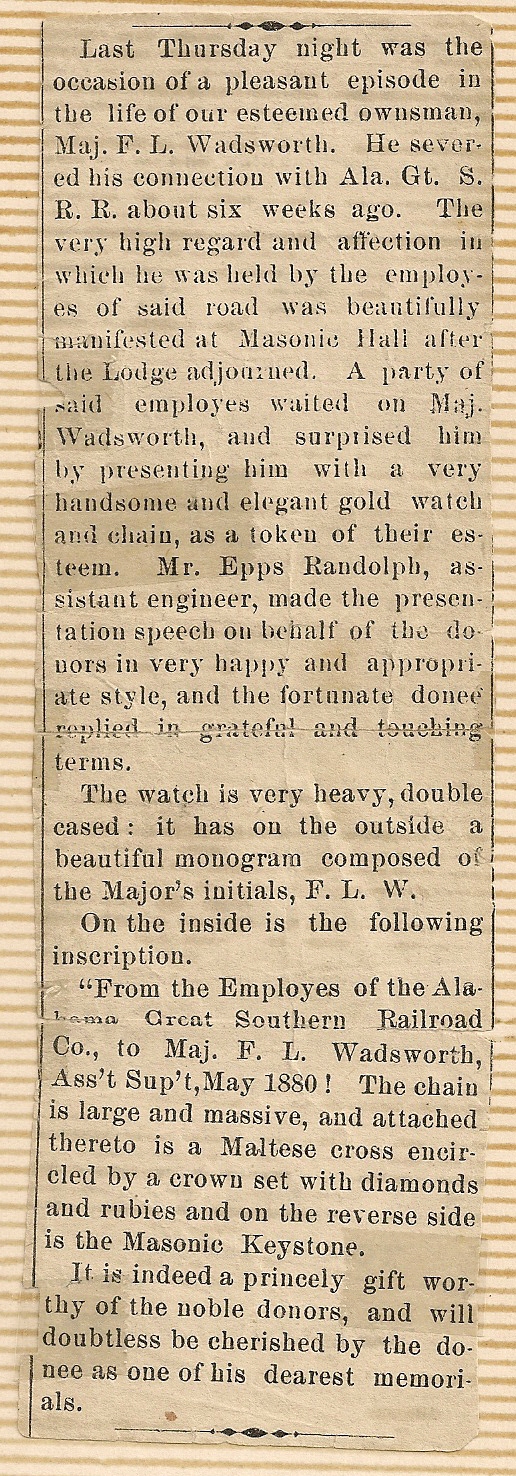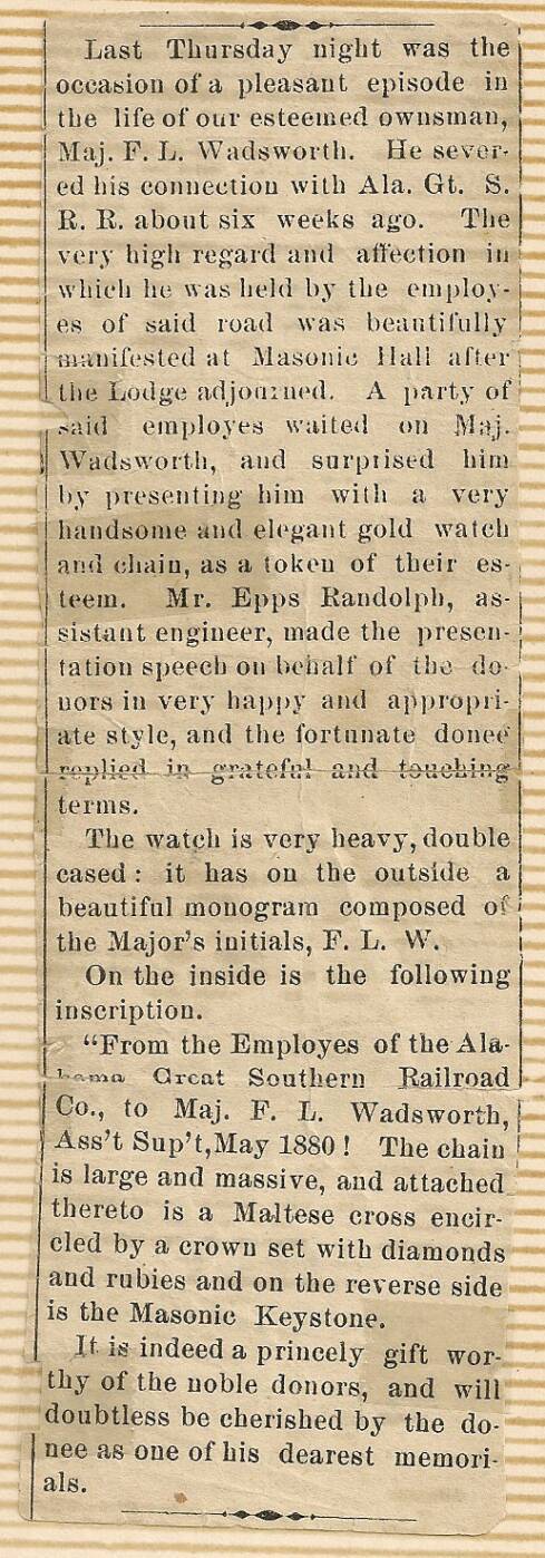 Major F.L. Wadsworth's brother, William Dwight Wadsworth (1846-1891) was a member of the Masonic Fraternity in 3rd degree and had been Grand Master of the State of Alabama.
