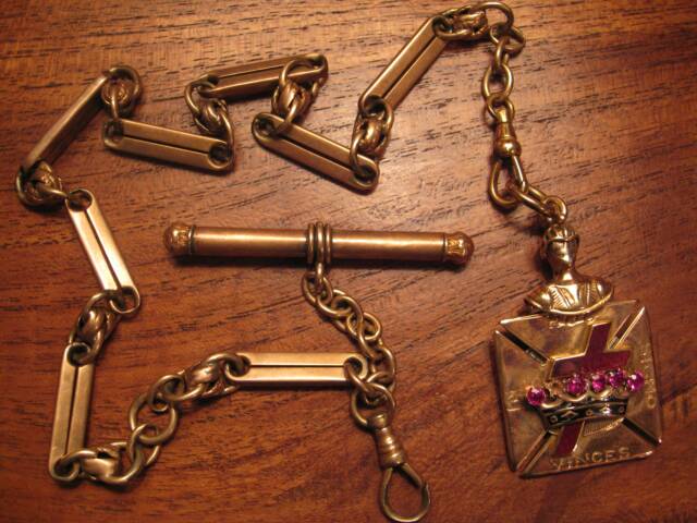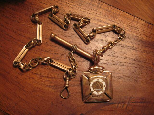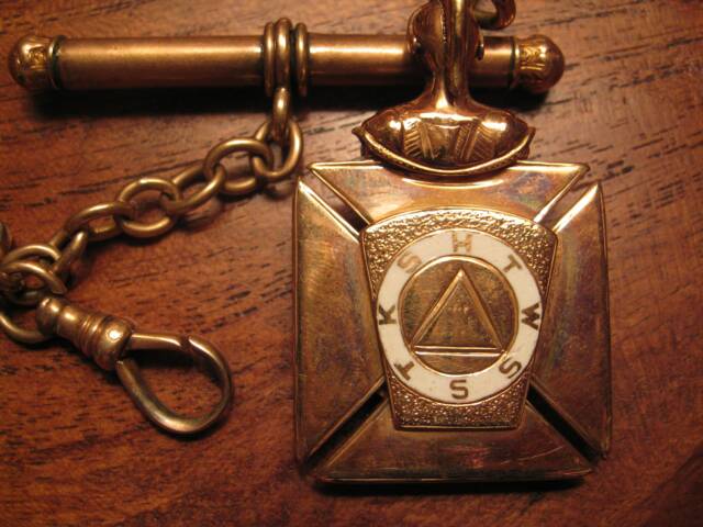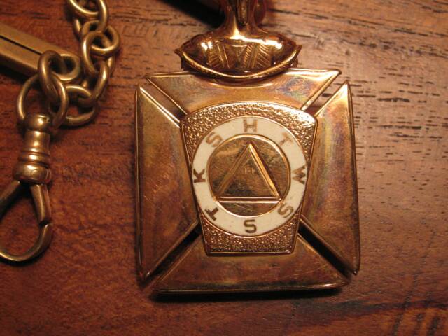 A "Royal Arch Mason" of the York Rite would usually have the Masonic emblem prominently displayed and would also bear the inscription "K S H T W S S T" within a circle on the inside of the 'keystone' symbol. An example of this is shown below which was attached to the watch fob given to Major Francis L. Wadsworth in May 1880 as a retirement gift by a party of employees from Alabama Great Southern Railroad Company.