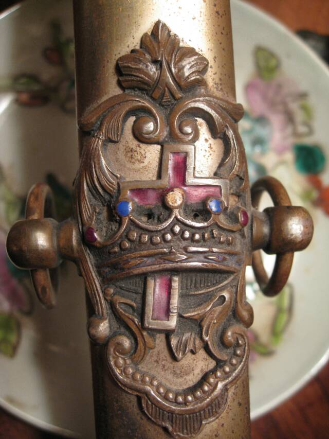 This photograph is of a Masonic Knights Templar symbol showing a cross within a crown inside a Maltese cross, which has the Latin phrase, "in hoc signo vinces." The phrase means "in this sign you shall conquer" and was used by Constantine as a military motto in the early 4th Century. The phrase was also used by the original Knights Templar military order that was founded during the Crusades. The Freemasons began using Templar rituals and symbols in the late 1700's.