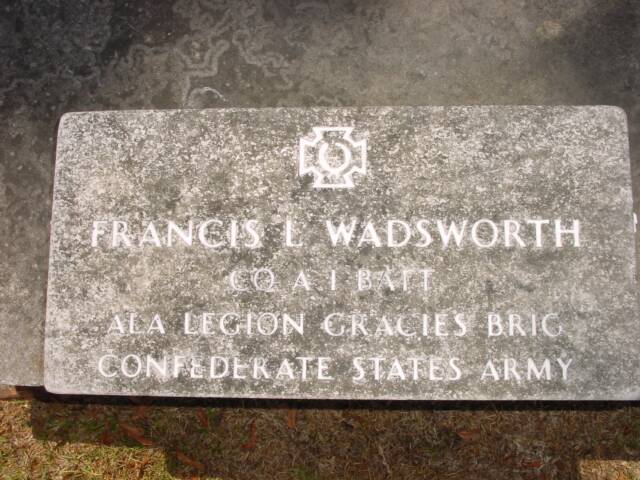 Major Francis L. Wadsworth was a civil engineer and first established himself in that profession. Francis was born in Montgomery, Alabama. He served in Co. F, 60th Regiment, Alabama Infantry attaining the rank of Major. After the war he moved to Birmingham, Al. where he became Secretary, Treasurer of Debarbalaben Coal and Iron. He also worked and retired from his job as Assistant Superintendent with the Alabama Great Southern Railroad in early 1880.